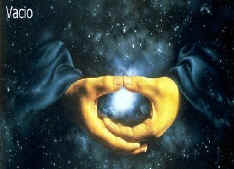 Mudra del Vacio: Se colocan los dedos juntos de ambas manos, la derecha y la izquierda, los doblas formando una curva como una esfera, haces lo mismo con ambas manos, pones encima la mano derecha de la izquierda y unes ambos pulgares de las dos manos, de tal manera que si tu ves de frente tus manos, veras la formación de un circulo, que colocarás también a la altura de la cicatriz umbilical. Este Mudra tiene como fin, buscar el vacío de tu mente, para que puedas encontrar al Ser Interno que llevas dentro, no es específicamente como los anteriores, para realizar un trabajo determinado de fijación de vitalidad o de otro tipo, en este caso se persigue el vacío de la mente y ahí es en donde puedes entrar en contacto con la esencia de vida interna, tu espíritu que eres, tu Yo Superior.